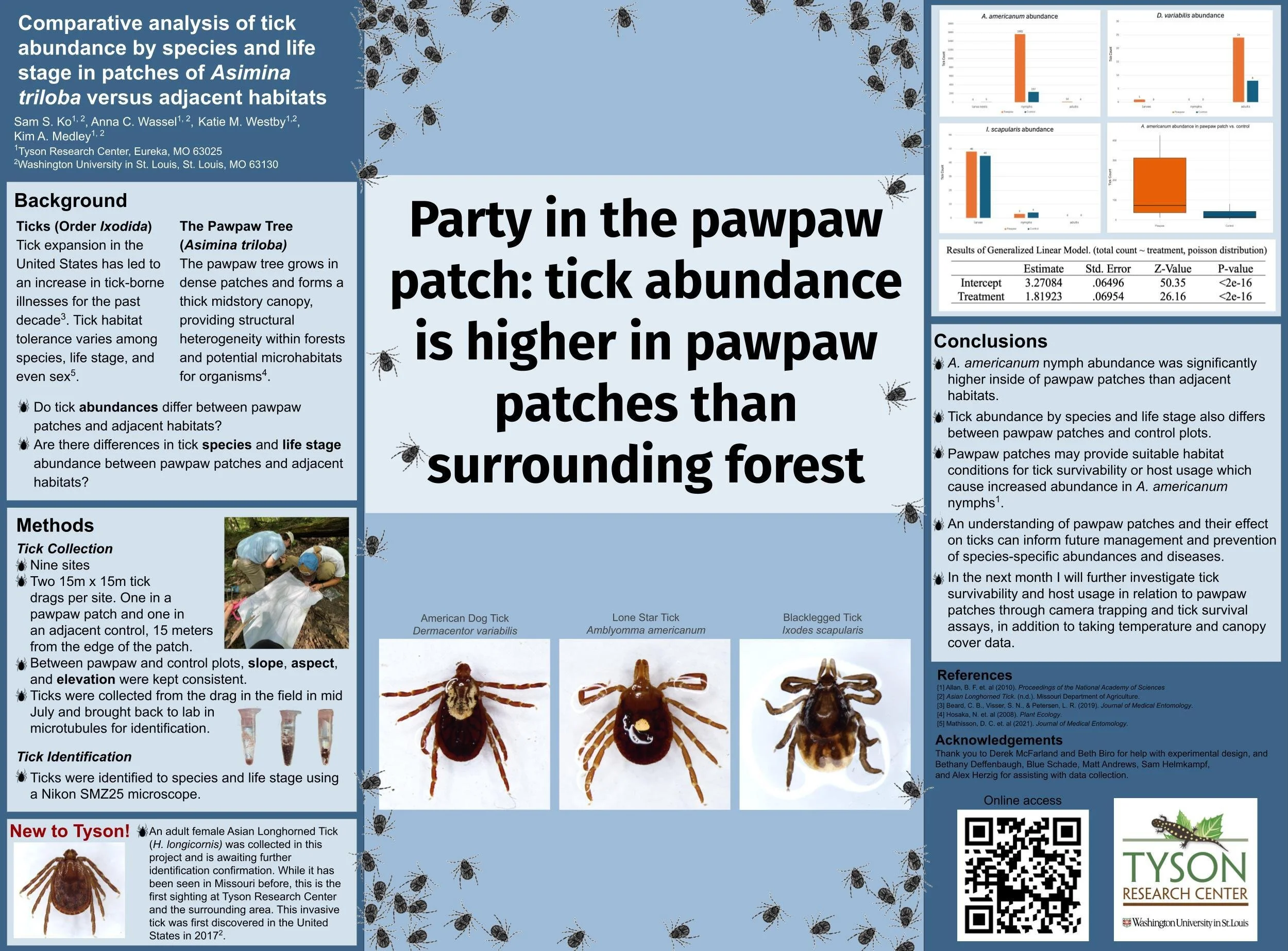 Comparative analysis of tick abundance by species and life stage in patches of Asimina triloba versus adjacent habitats